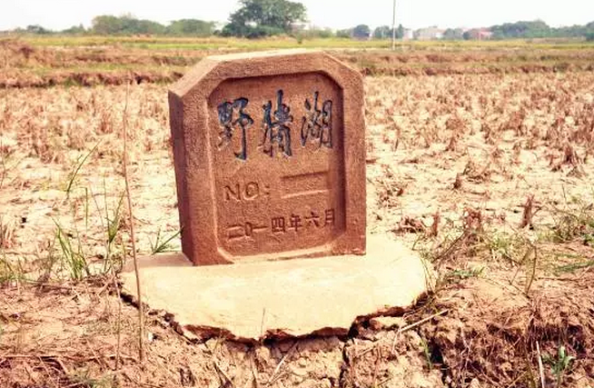 苗淼和我带着好奇和疑问到达了目的地,令人惊讶的是,所见之处竟是干旱龟裂的土地,别说一个湖,就连一条小溪的影子也没见到。我再次和孝感市水利局的工作人员确认,工作人员走下车指着一块石桩,上面写三个大字:“野猪湖”。
