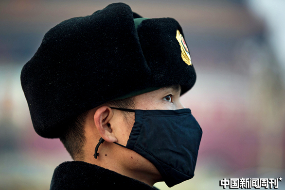 雾霾天气中,戴着口罩在天安门广场执勤的警员。