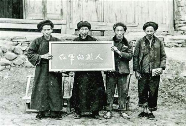 1984年,秀山县政府向李木富老人(左二)赠送题写着“红军的亲人”的匾额(资料照片)。 新华社发
