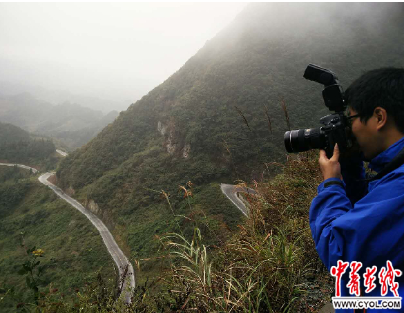 采访团成员在路边拍摄“秀山45拐”
