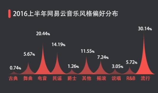 在网易云音乐这个平台上,各个城市最受欢迎的音乐类型统计中,除传统流行音乐市场之外,民谣和电子已成为当下音乐风格中的绝对霸主。