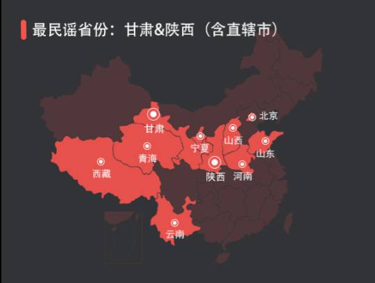 根据数据,甘肃和陕西省作为西北的传统民歌摇篮,可谓是民谣风的传播重镇。这两个省份排在用户偏好首位的音乐风格均是民谣,且用户覆盖量极大,堪称“最民谣省份”: