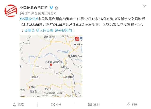 #地震快讯#中国地震台网自动测定:10月17日15时14分在青海玉树州杂多县附近(北纬32.85度,东经94.89度)发生6.3级左右地震,最终结果以正式速报为准。