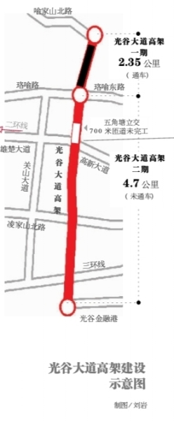 据了解,武汉光谷大道高架北接东湖隧道,南达雄楚大道、三环线及金融港,共分两期建设,一期喻家山北路-珞喻东路2.35公里高架已于去年通车。二期高架从珞喻东路由北向南,经雄楚大道高架、凌家山北路、三环线至光谷金融港,全程4.7公里,高架主线双向6车道,设计时速60公里/小时。
