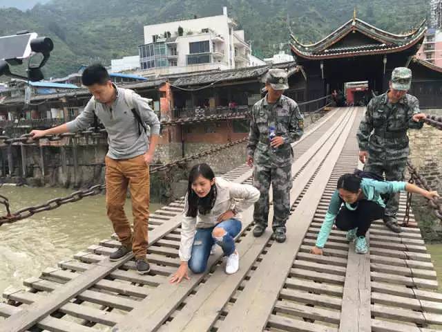 在新华社推出的《红色追寻——三个年轻人的长征路》网络直播中,三位主播和来自“飞夺泸定桥红二连”的战士一起通过泸定桥,感受当年夺桥的惊险(9月22日摄)。新华社记者 陈子夏 摄