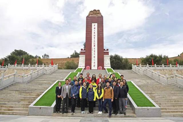 9月26日,新华社大型主题网络直播栏目《红色追寻》在宁夏将台堡圆满收官,红军后代及直播团队在中国工农红军长征将台堡会师纪念碑前合影。新华社记者 王鹏 摄