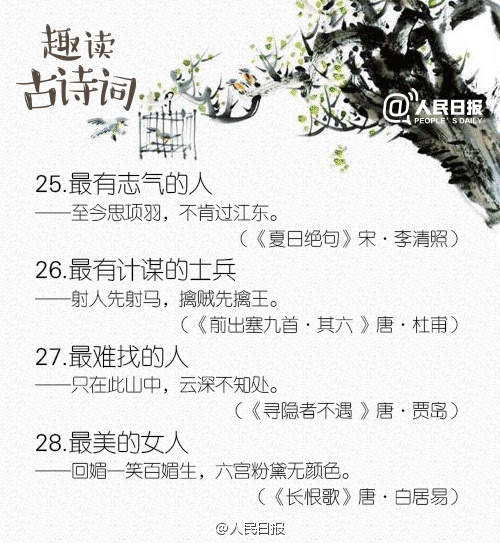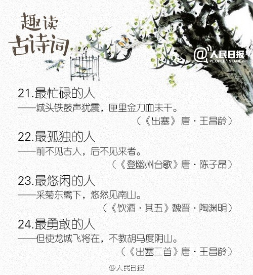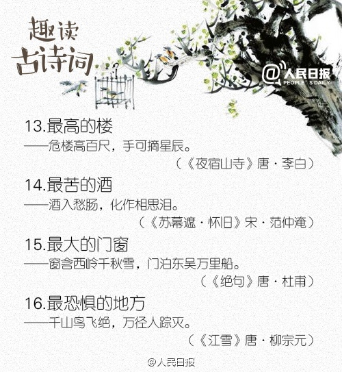 中国古诗词文化博大精深,寥寥数字,便能写尽无限烟波:①最瘦的人——帘卷西风,人比黄花瘦。②最苦的酒——酒入愁肠,化作相思泪。③最多的愁——问君能有几多愁,恰似一江春水向东流。④最长的情——天长地久有时尽,此恨绵绵无绝期。这样读,是不是多了几分趣味?