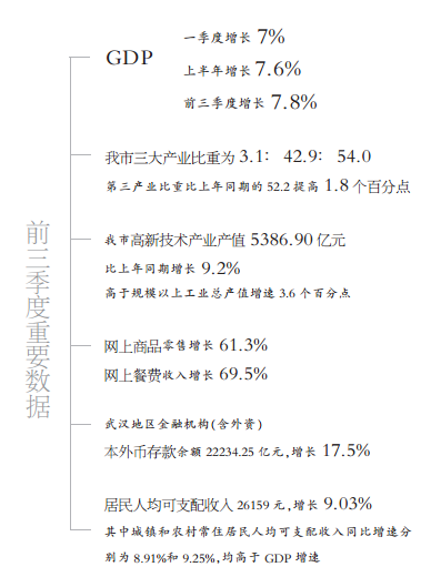 昨日(24日),武汉市统计局与国家统计局武汉调查队联合发布今年前三季度我市经济运行情况。在服务业、高新技术产业发展等多重利好因素下,前三季度我市地区生产总值增长7.8%。
