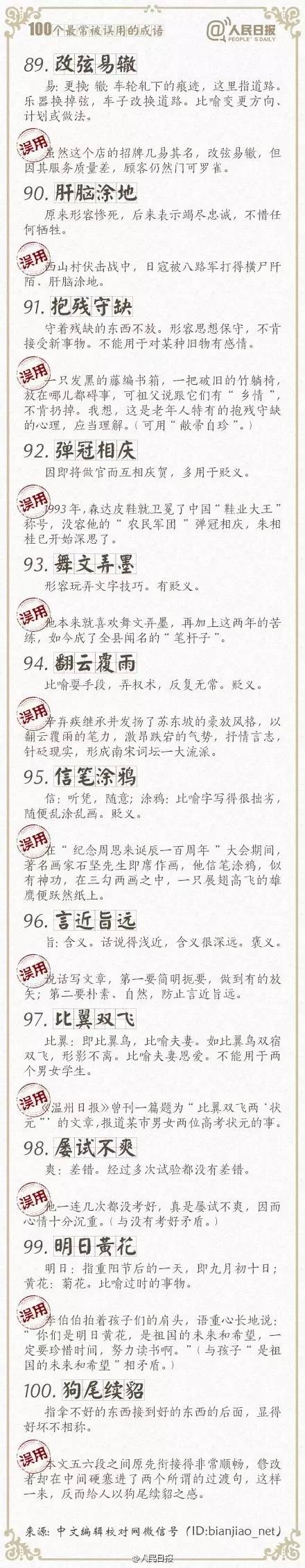 ①万人空巷:形容盛大集会或轰动一时的情景;②改头换面:比喻只改形式不改内容,贬义;③不情之请:不合情理的请求,常用作客套话;④差强人意:大体上还能够使人满意…工作生活中,成语被误用的情况不在少数。100个常被误用的成语,你用对了吗?快来一起学习吧!