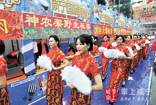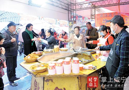 赤壁的青砖茶和一合酥、崇阳的众望麻花和三普野桂花蜂蜜、通山的包坨和麻饼、咸安的旅宁鸡汤和向阳湖荷叶茶、嘉鱼的簰洲鱼圆和臭干子、老通城豆皮和黄袍农夫紫苏辣椒酱……各式各样的咸宁美食,引得人们纷纷解囊。