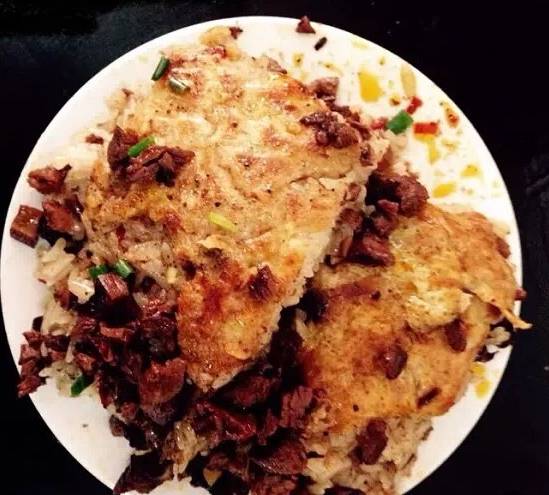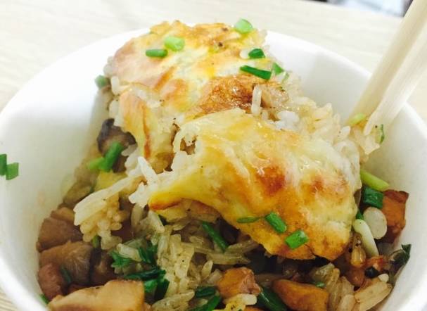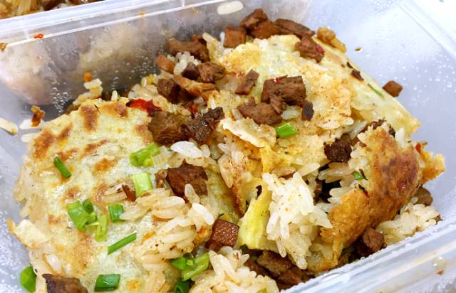 然后铺上满满的糯米饭,一半牛肉一半三鲜,煎一下后撒上葱花,然后切成小块,添起来再淋上一瓢卤水,据说王师傅豆皮就特别在他那一瓢卤水里面,很少能吃这种里面有卤水的豆皮。