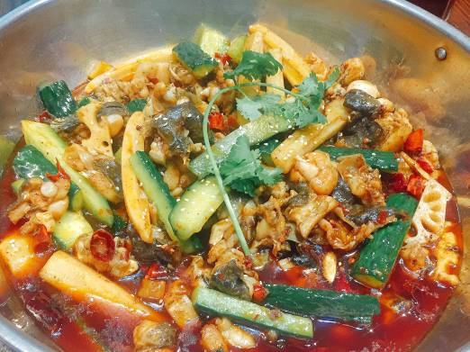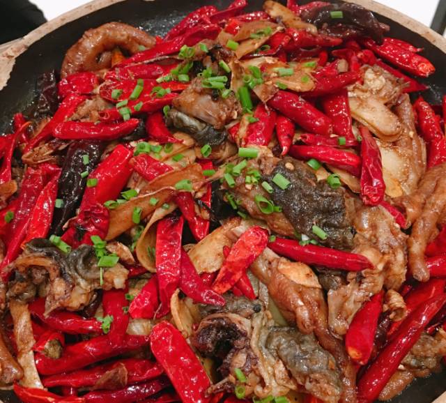 姜辣凤爪拼牛蛙,姜的辣味很浓,吃完喉咙里都是辣味,牛蛙带皮而且炸过,烂而不老,鸡爪也是很入味。蒜香小排肉很嫩很香,鱼香肉丝简直就是一大盆。
