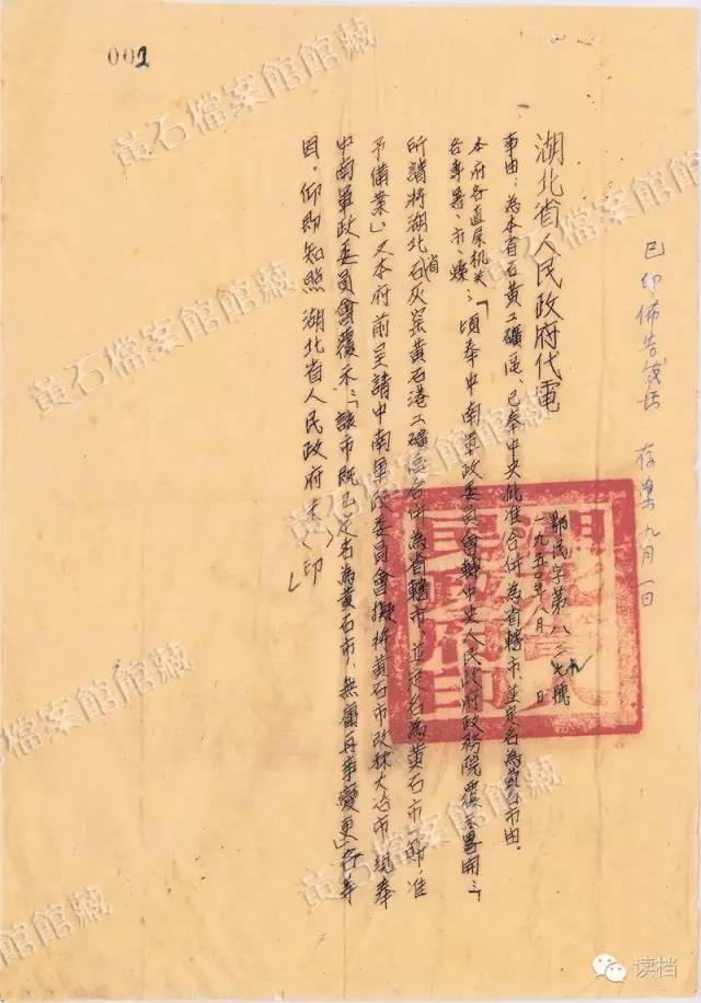 8月21日,中央人民政府政务院电告中南委,所请将湖北省石灰窑、黄石港工矿区合并为省辖市并定名为黄石市一节,准予备案。