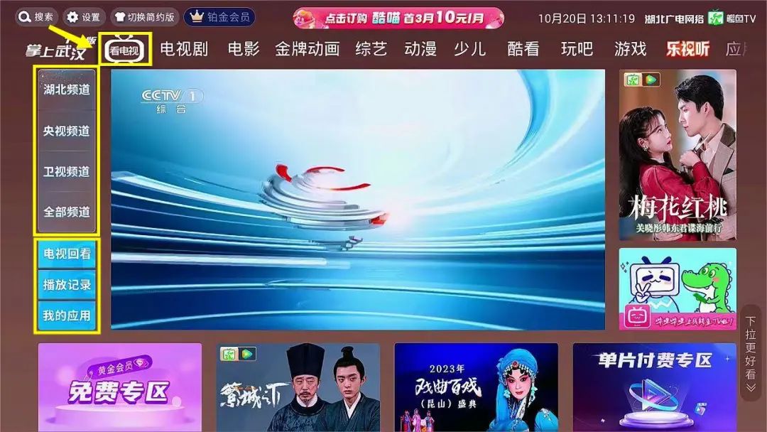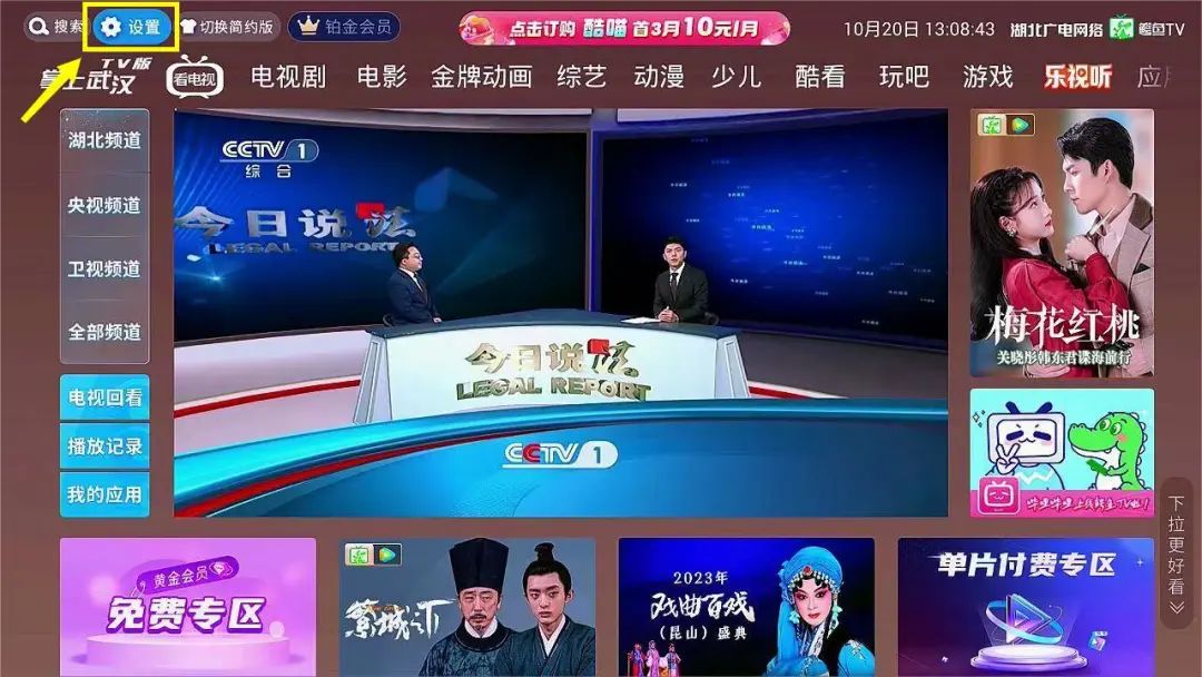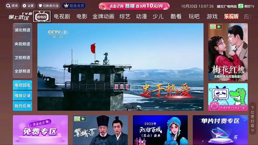 首页统一落焦在“看电视”,窗口左侧竖列排放直播频道分类列表“湖北、央视、卫视、全部频道”,用户能直达喜爱频道。电视回看、播放记录、我的应用等常用功能直观呈现,便于用户选择。