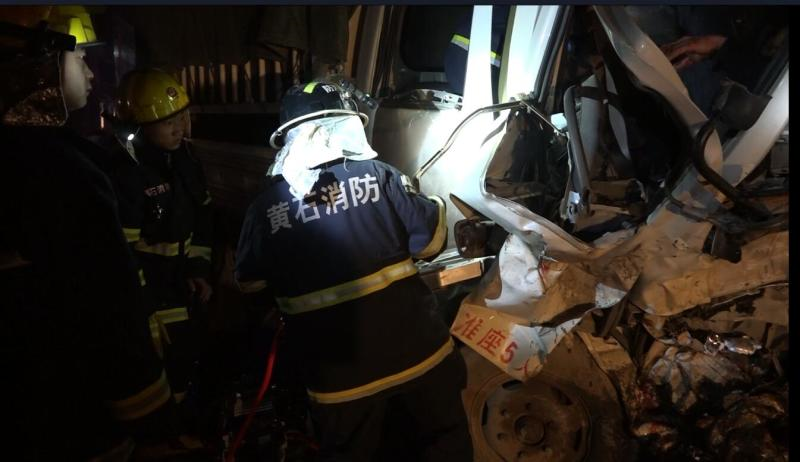 4时06分阳新县消防中队官兵赶到现场,由于两辆车紧紧贴着,无法展开救援,于是消防官兵先用钢索将SUV拉开,此时货车车头附近已满是SUV泄漏的机油,为防止意外,消防官兵先用干粉对其覆盖,随后通过牵引、扩张等方法,经过四十多分钟的紧张救援,成功把两名被困人员救出。