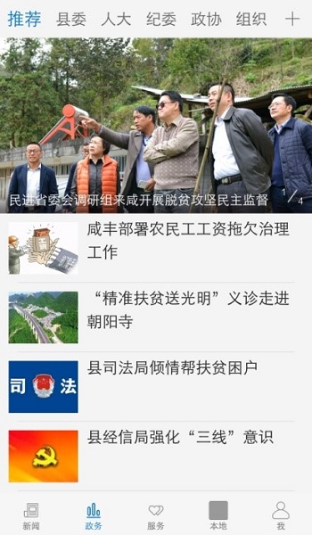 “云上咸丰”客户端主要分为【新闻】【政务】【服务】【本地】【我】五个板块,便于受众及时浏览最新资讯,便捷办理政务事务,服务百姓生活。咸丰县各部门在合理分工的同时团结协作,齐心助力“云上咸丰”建设。咸丰县委宣传部联合全县各单位运用官方文件、网站、微信、微博、工作群等多种渠道推广“云上咸丰”。咸丰新闻网、咸丰县电视台、咸丰县新闻中心等多家媒体负责客户端相关功能、运用、形象的宣传,让更多受众知晓并运用“云上咸丰”。