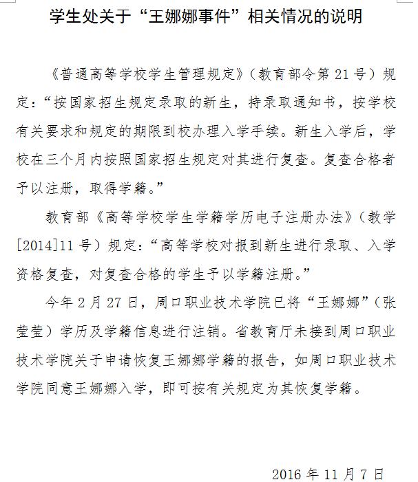 《河南省教育厅学生处关于“王娜娜”事件的情况说明》