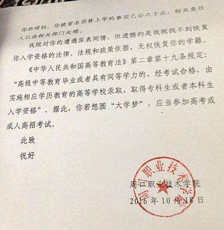 9月14日,王娜娜向周口职业技术学院邮寄《学籍恢复申请》。10月18日,周口市职业技术学院出具回函称:“在2003年规定时间内,王娜娜已经持录取通知书到校报到,当年录取通知书已经完成使命……你被冒名顶替上学的事实已公之于众,相关责任人已有相关部门处理……找不到恢复你入学资格的法律、法规和政策依据,无权恢复你的学籍。”
