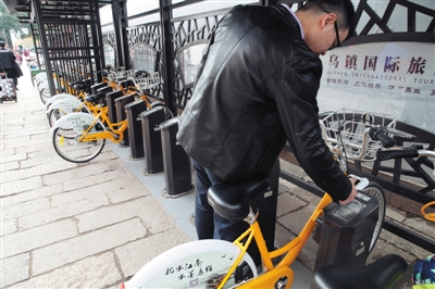 2015年12月8日,浙江乌镇,一位游客正在通过扫描二维码,租赁自行车。记者 李冬摄
