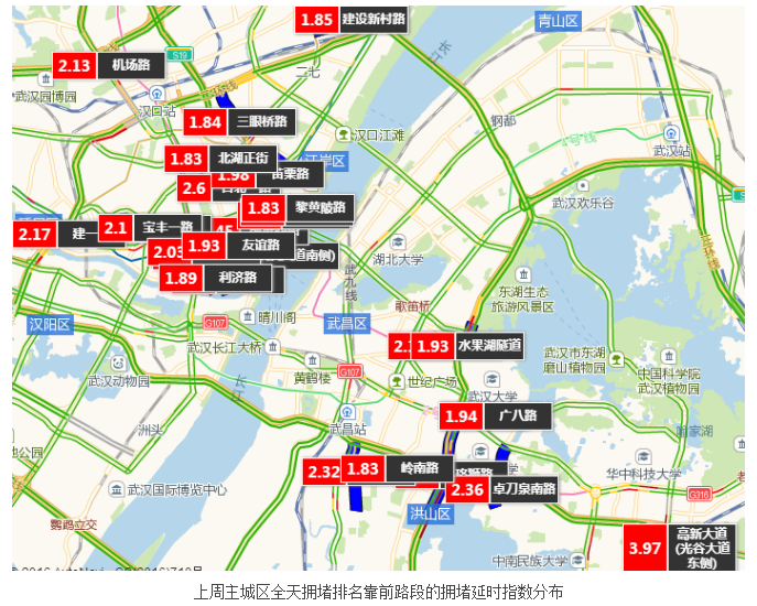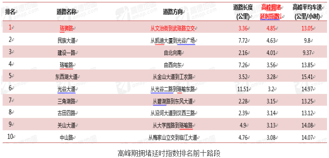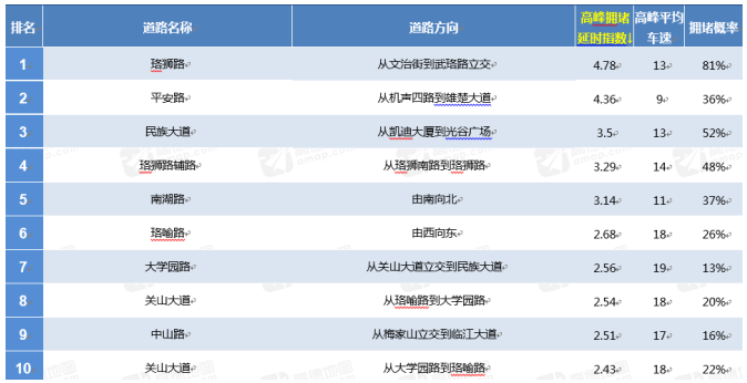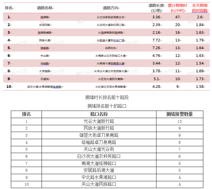 通过与前一周预测拥堵的十条路段相比,上周高峰期拥堵排名前十路段有60%是重复的,其中东西湖大道、古田四路近期内首次进入拥堵前十名。