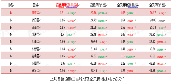上周全市道路日均交通拥堵延时指数为1.55,较前一周上升2.24%,日均高峰期交通拥堵延时指数为1.93,较前一周上升4.12%。上周日均车速为29.78km/h,较前一周下降2.08%,日均高峰期车速23.93km/h,较前一周下降3.84%。