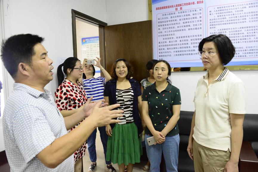 在崇阳县人民调解协调指导中心,彭丽敏听取了婚姻家庭纠纷人民调解委员会工作开展情况,对崇阳县依托调解中心增设家调委、由第三方参与调解工作给予了充分肯定。她希望,要以县级调解中心为平台,将调解工作延伸至乡镇(街办)、村(社区);各级在参与婚姻家庭矛盾调解工作中,要在“和”字上多下工夫、多做文章;工作过程中注重心理疏导,传递平等、和谐、文明、健康的婚姻家庭理念;要加强队伍建设,注重老、中、青相结合,注重各类专业人才互补,特别将一些有热情、有威望的老干部、老教师吸纳到队伍中,将她们培养成“和事佬”、“代言人”,以群众性、传统性、地方性、通俗性的调解方式化解纠纷矛盾。
