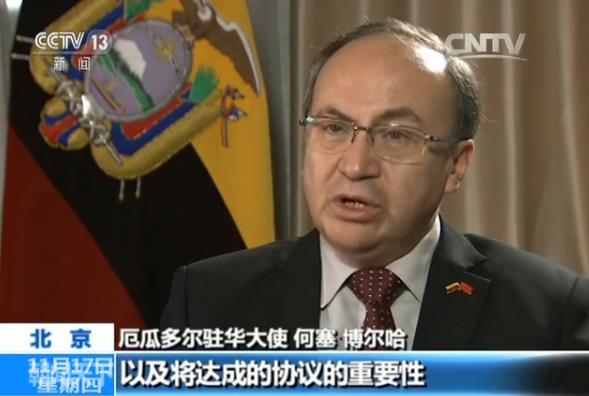 厄瓜多尔驻华大使何塞· 博尔哈在接受央视记者采访时表示,作为中厄建交以来首位到访厄瓜多尔的中国国家主席,习近平主席的访问意义非凡,必将推动中厄双边务实合作结出更多硕果。