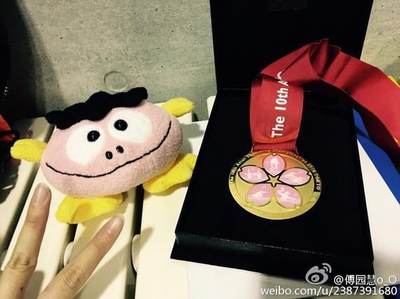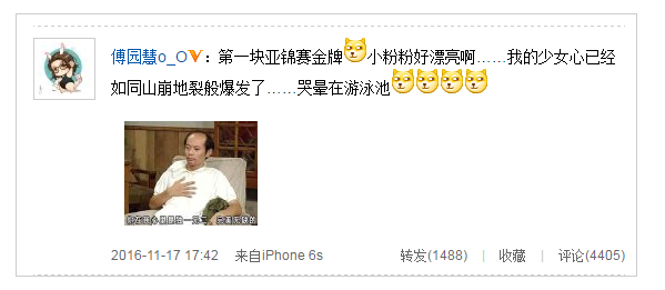 赛后,兴奋的傅园慧在微博中写道:“第一块亚锦赛金牌!小粉粉好漂亮啊……我的少女心已经如同山崩地裂般爆发了……哭晕在游泳池!”