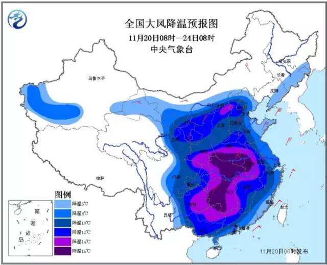 这是中央气象台今天早上6点发布的大风降温预报图