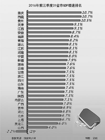 2016年只剩下30余天,从已公布的各项数据看,全年6.5%以上的经济增速可期。截至11月22日,31个省份已陆续公布各自前三季度经济增速及相关指标。西藏、重庆、贵州、天津、江西、安徽、福建等26个省份GDP增幅“跑赢”全国,其中有23个省份GDP增速超过了7%。