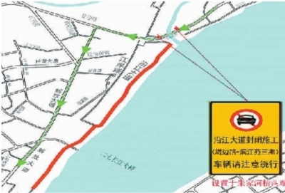 沿江大道(滨江苑三期出口至谌家矶大道)禁止机动车、非机动车、行人通行。需通行施工路段的机动车、非机动车、行人,可绕行永泰路、黄浦大街、解放大道、堤边路等周边道路。交警建议绕行线路:
