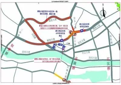 2、解放大道航空路方向往月湖桥过汉江车辆,请通过航空路转盘一层绕行武胜路、京汉大道,或直行至硚口路口西侧550米处63中信号灯处调头。