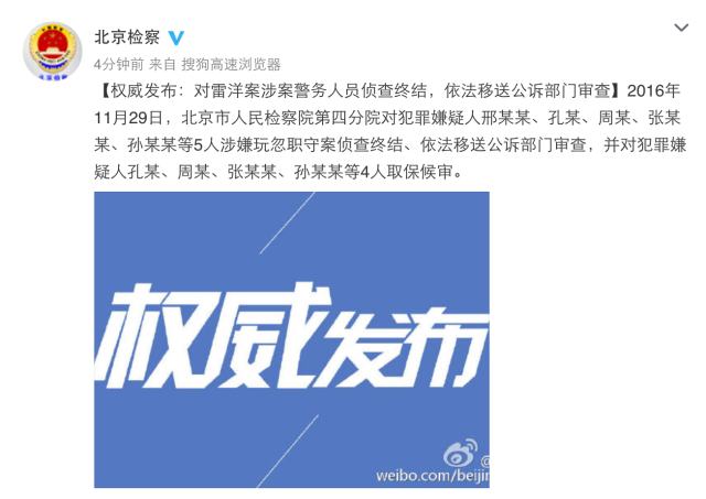 【权威发布:对雷洋案涉案警务人员侦查终结,依法移送公诉部门审查】2016年11月29日,北京市人民检察院第四分院对犯罪嫌疑人邢某某、孔某、周某、张某某、孙某某等5人涉嫌玩忽职守案侦查终结、依法移送公诉部门审查,并对犯罪嫌疑人孔某、周某、张某某、孙某某等4人取保候审。