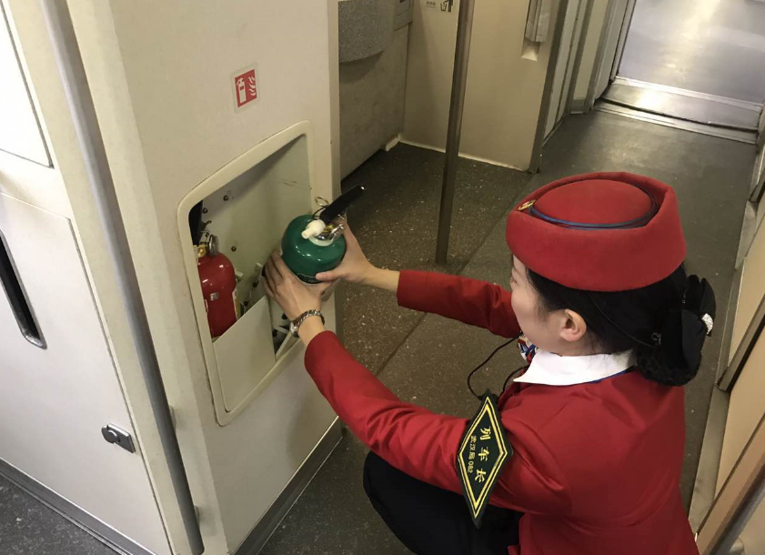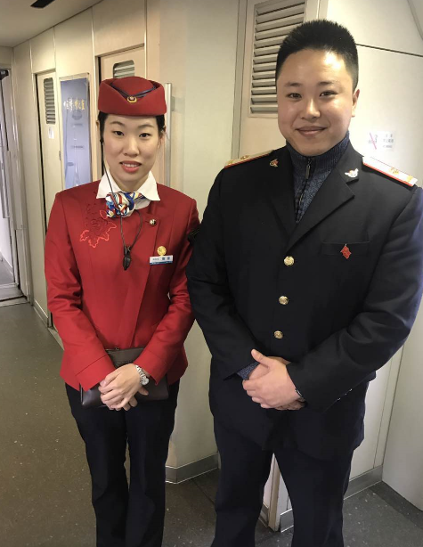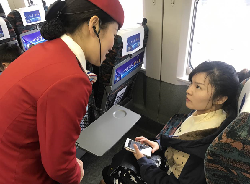 武孝城铁车长曹雪和武汉客运段城际车间团总支书记郭亮正在为列车上的乘客进行温馨服务,并进行列车上的安全检查。