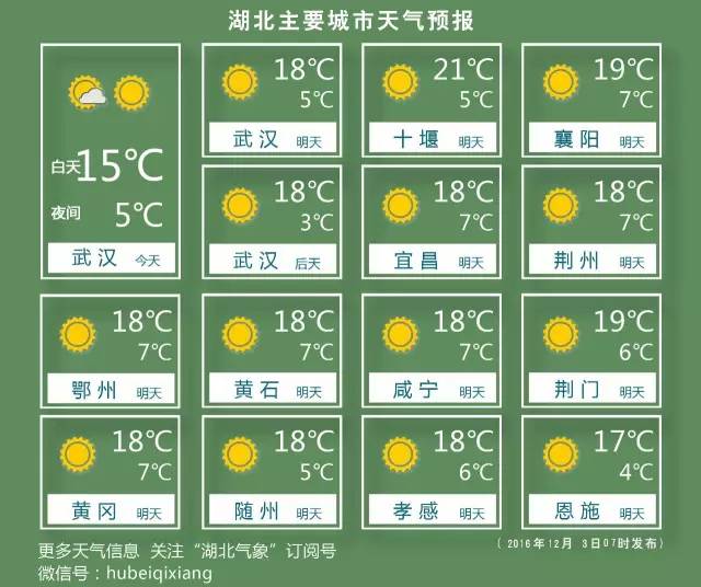 根据最新的预报结论:除了今天恩施局地有小雨外,未来三天湖北省大部地区依然以多云到晴为主,最高气温将达到16-19℃!不过后天受一股弱冷空气影响,湖北省风力将有所增大,尽管午后依然是暖洋洋的,但是早晚气温只有1-4℃。