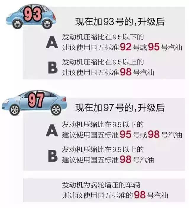 以前使用93号汽油的车可加92号或95号,以前使用97号汽油的车辆可加95号或98号,建议中高档车使用95号以上汽油。
