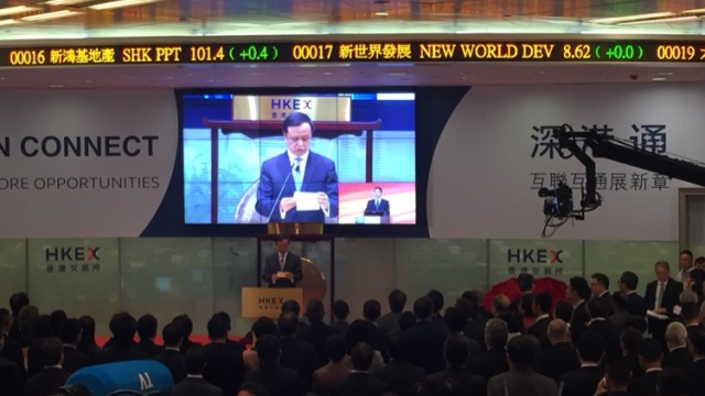 深港两地同时鸣钟鸣锣,深港通正式开市。