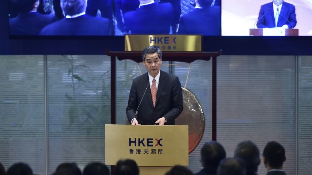 5日上午,香港特区行政长官梁振英与香港交易所主席周松岗在港交所共同为当日首笔交易鸣锣开市,标志着深港通正式启动,深港两地证券市场实现联通。