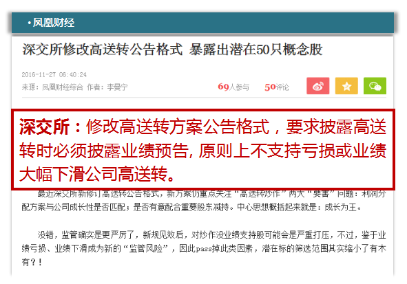 除了我们自己可以调研判断,监管层也在为投资者争取知情权。11月25晚,深交所出了个关于高送转的公告,内容大致是要求修改高送转方案公告格式 , 要求披露高送转时必须披露业绩预告 , 原则上不支持亏损或业绩大幅下滑公司高送转。