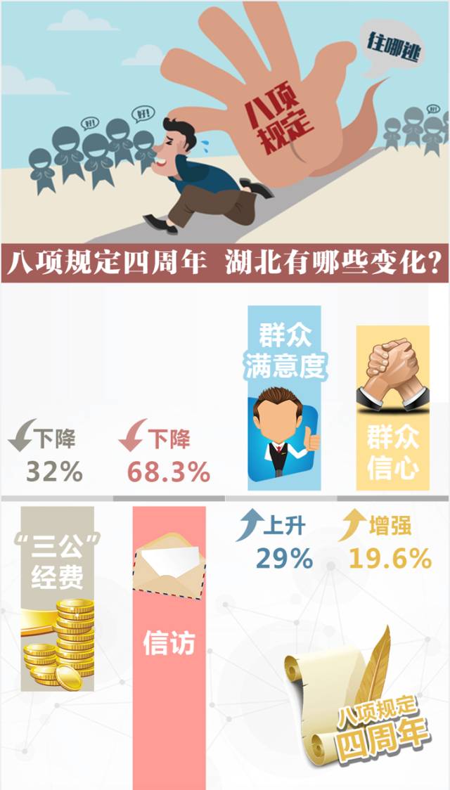 八项规定出台四年,“全面从严治党”的清风吹遍荆楚大地,这四个数字就可以说明湖北的变化:“三公”经费下降32%;信访下降68.3%;群众满意度上升29%;信心增强19.6%。