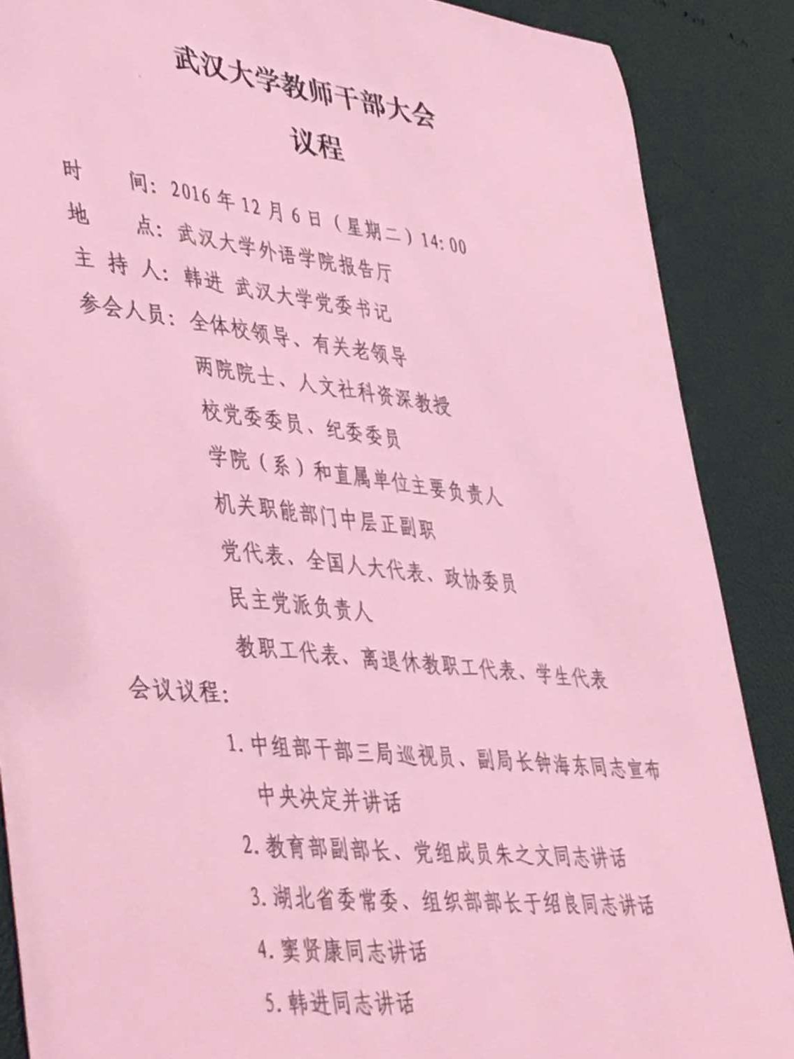 12月6日下午,武汉大学在外国语言文学学院学术报告厅召开武汉大学教师干部大会。会上,中组部干部三局巡视员、副局长钟海东宣布了中央关于武汉大学校长任命决定,窦贤康任武汉大学校长。