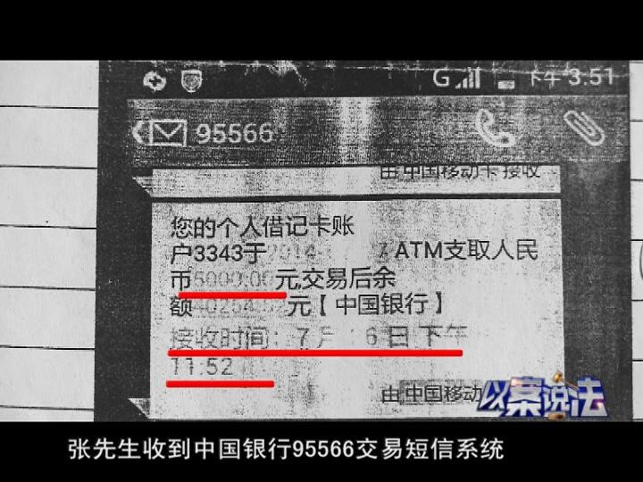 2014年7月26日晚11时52分,家住荆门市东宝区的张先生突然手机收到了一条中国银行95566发来的短信,信息提示,张先生的个人借记卡账户在ATM上支取人民币5000元。