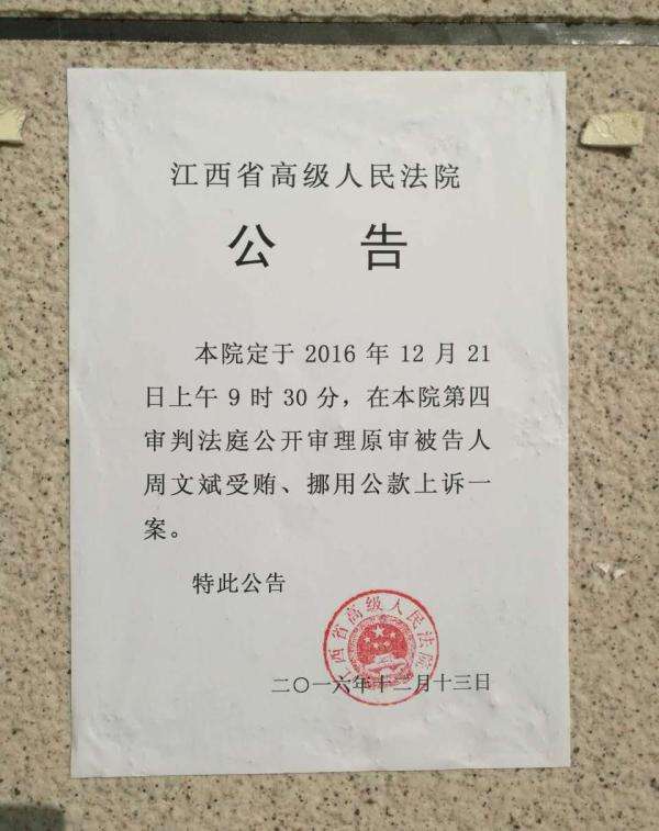 12月16日,澎湃新闻记者从江西省高级人民法院获悉,南昌大学原校长周文斌受贿、挪用公款上诉一案将于2016年12月21日上午9时30分,在该院第四审判法庭公开开庭审理。12月13日,江西高院在法院大门前张贴了上述案件的开庭公告。