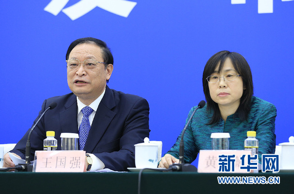 12月25日,国家卫生计生委副主任、国家中医药管理局局长王国强(左)和全国人大常委会法工委行政法室副主任黄薇在北京出席全国人大常委会办公厅新闻发布会并回答关于《中华人民共和国中医药法》的问题。当日,随着十二届全国人大常委会第二十五次会议表决通过,我国首部为传统中医药振兴而制定的国家法律——《中华人民共和国中医药法》诞生,为继承和弘扬中医药、促进中医药事业健康发展提供有力法律支撑。新华社记者 张玉薇摄