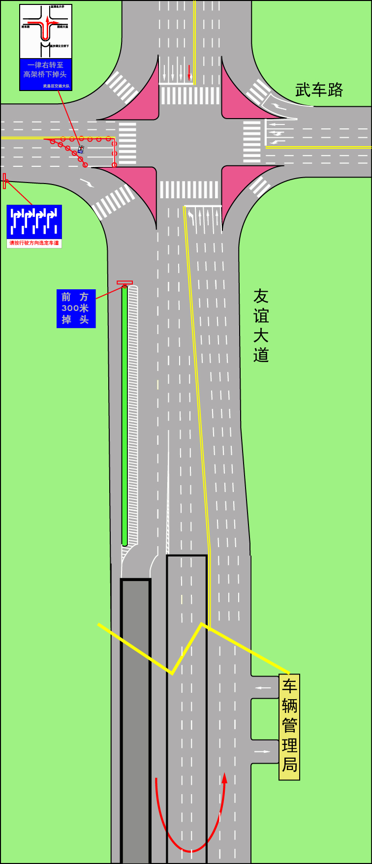 为缓解路口的交通滞留程度,提高路口其他方向的通行能力,武昌区交通大道经过研究,拟从2017年1月4日起,对武车路和平大道往友谊大道方向的车流进行调整,武车路进入友谊大道路口(西向东方向):禁止左转与直行,需左转和直行车流一律在路口右转行至沙湖立交桥下专用掉头车道通行。从而减少路口信号灯周期,延长友谊大道双向通行时间,提高通行效率。