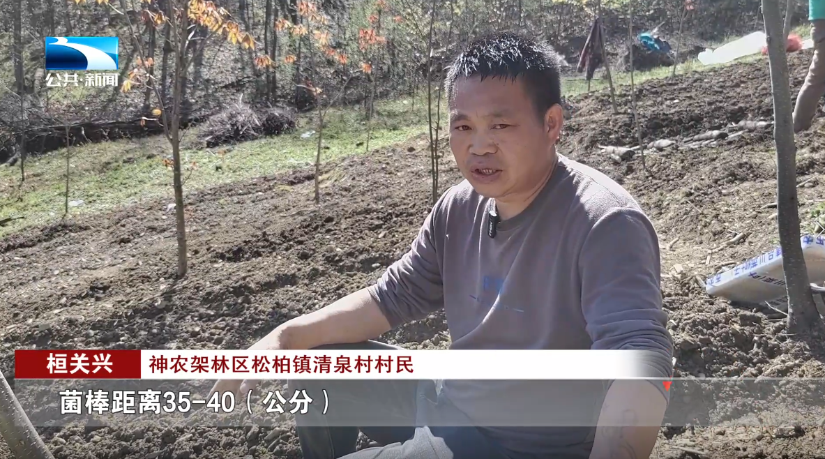 神农架林区松柏镇清泉村村民 桓关兴:“菌棒距离35-40(公分),麻籽大的放16个,小的放18个,上面土盖个10公分左右,上面用叶子覆盖一层。”