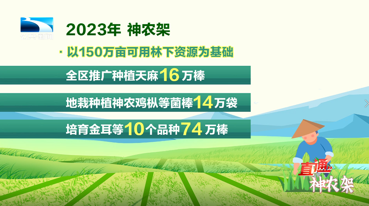 2023年,神农架以150万亩可用林下资源为基础,全区推广种植天麻16万棒,地栽种植神农鸡枞等菌棒14万袋,培育金耳等10个品种74万棒,开发十菌汤包、桑黄茶等30余种产品,利用“832”“慧农帮”等平台销售农副产品5000多万元。