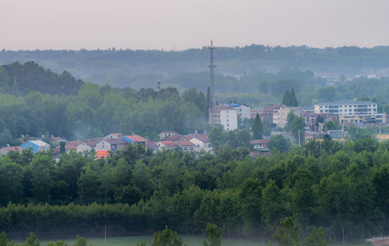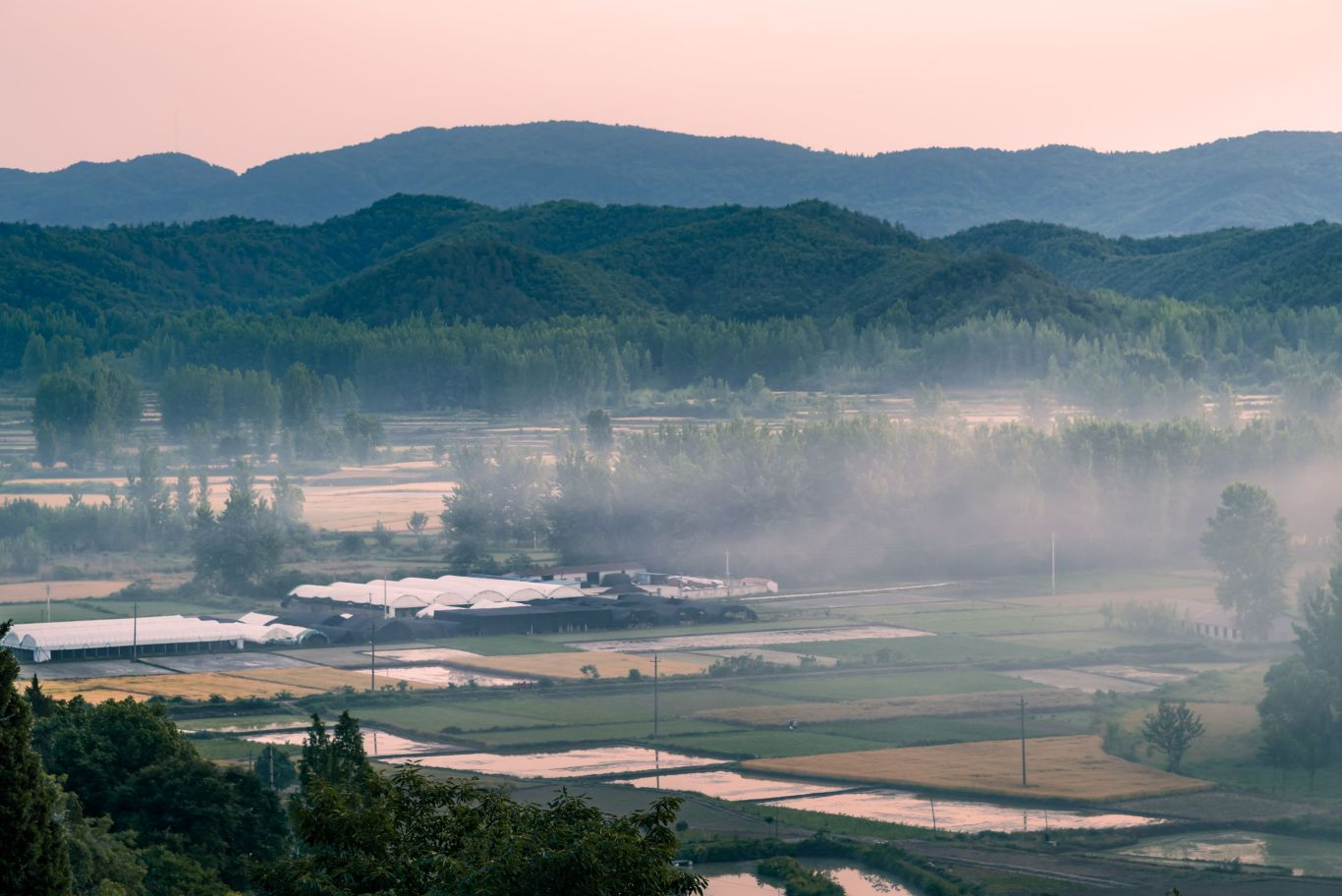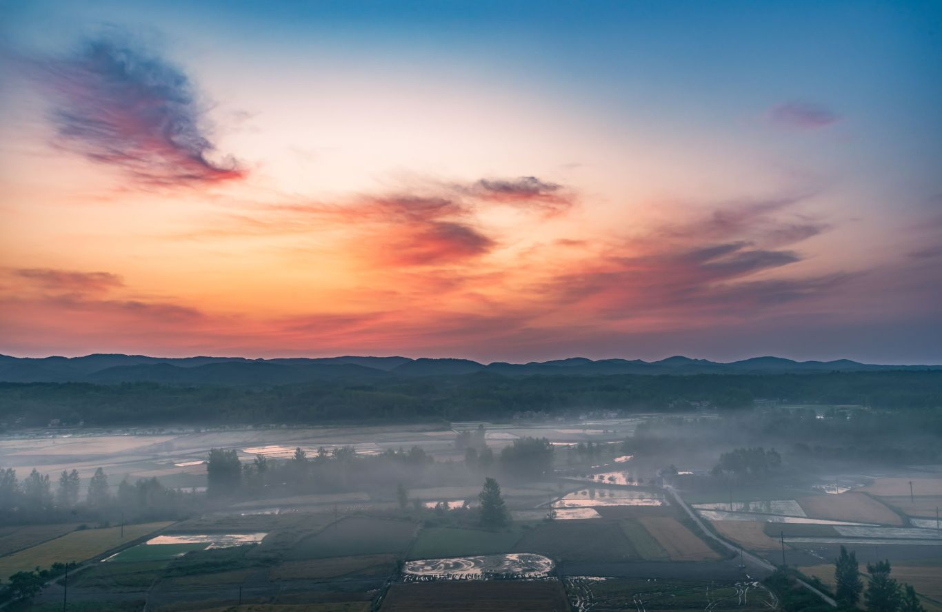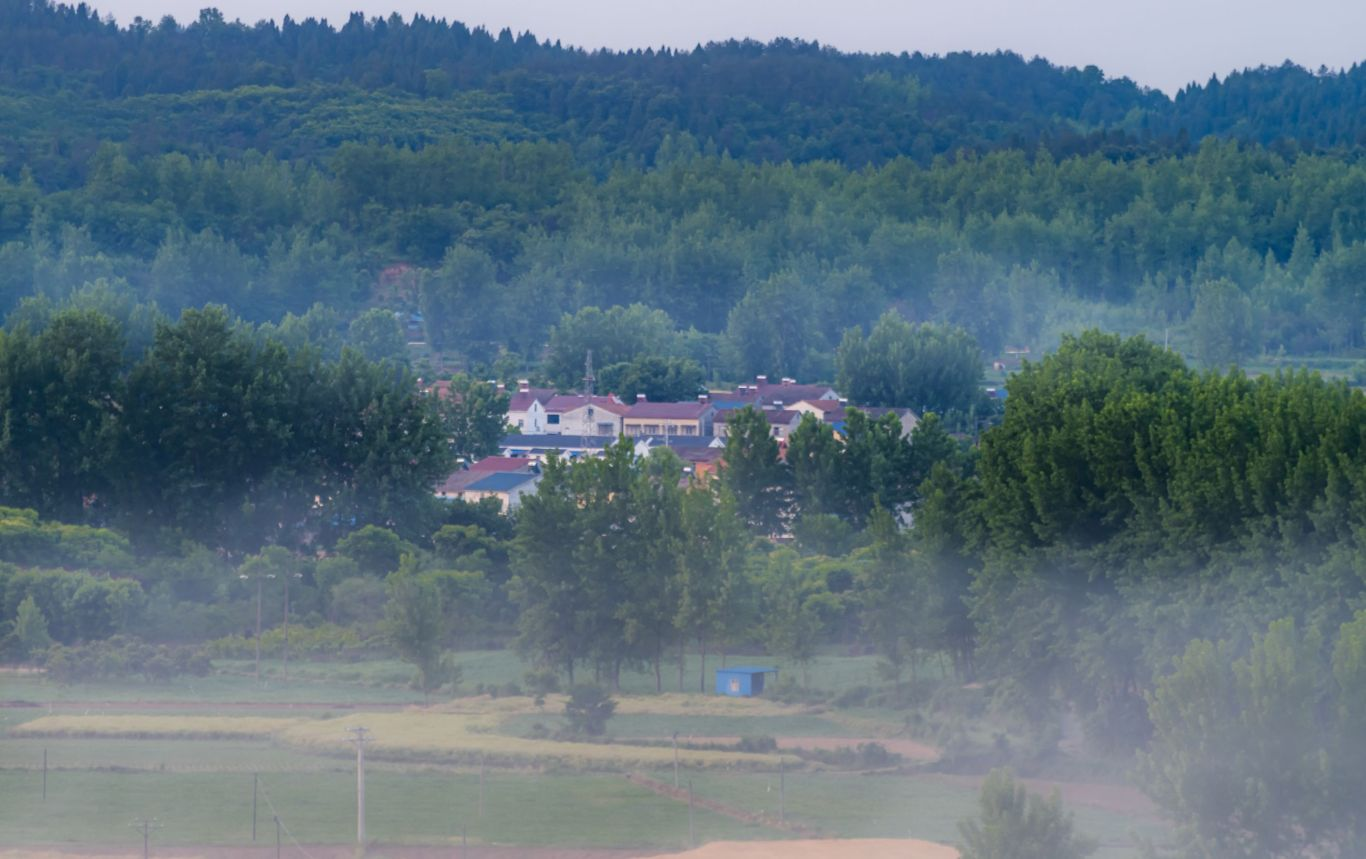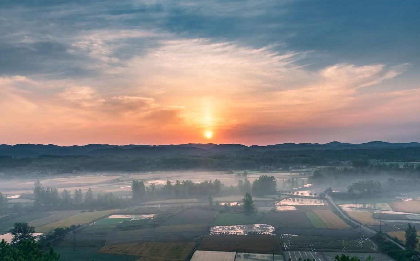 当阳光穿透晨雾,美景也渐次展现于眼前,山色与阳光携手,映照天空,色彩斑斓的树林与恬静的村庄相映成景,美如画卷。