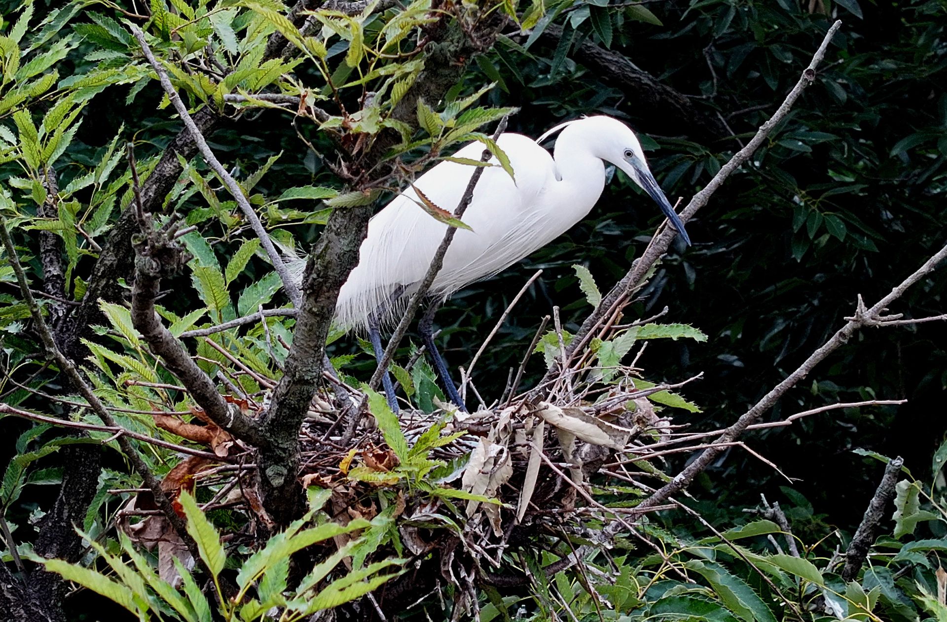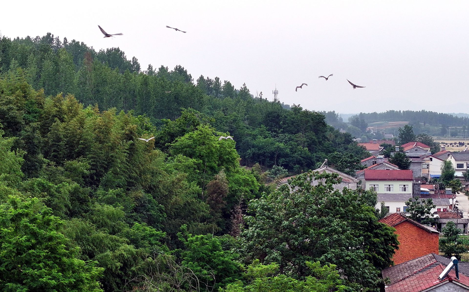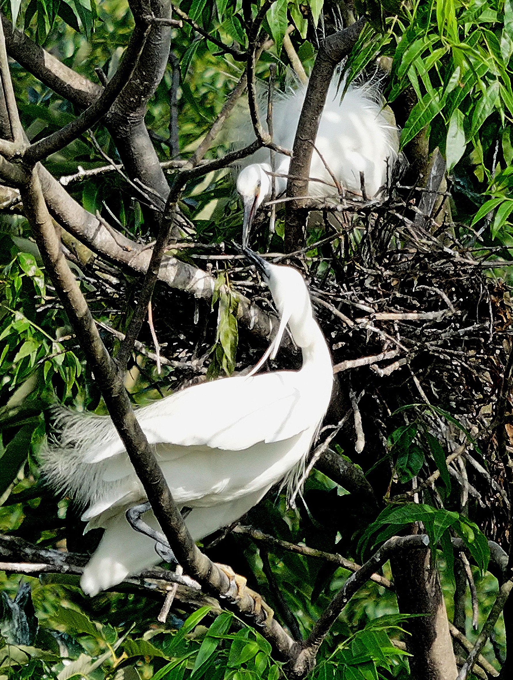 据社区居民介绍,自从3月份以来,上千只白鹭就在房后飞来飞去,选址做窝。最多的一棵树上能做三至五个窝。