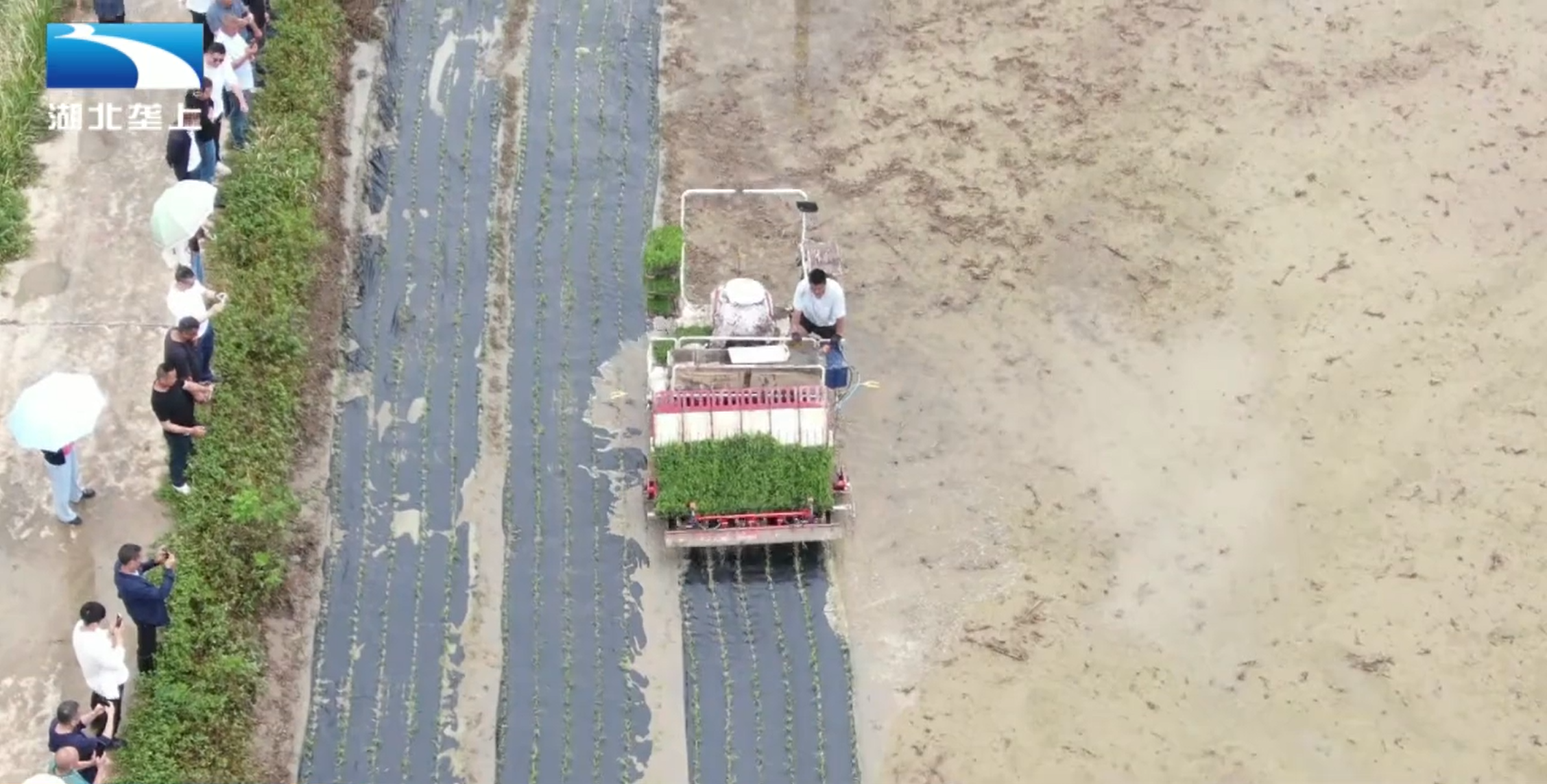 前两天下午, 在荆州市荆州区的一块水田里,插秧机走过,稻田里不仅出现了整齐的秧苗,还有一层黑色地膜覆盖在田间。